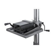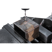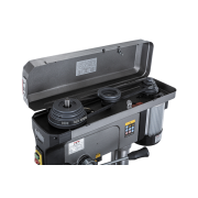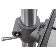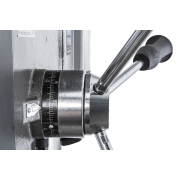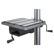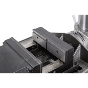 Стол имеет возможность поворота вокруг колонны на 360° и наклона вправо/влево по градуированной шкале на ±45°. Также может устанавливаться под углом в 90° для сверления в торце длинной заготовки. С другой стороны рабочего стола размещены встроенные тиски с шириной губок 210мм, расходом на 165мм и величиной перемещения вперед/назад на 165мм. Для упрощения размещения заготовки в тисках на станке встроен лазерный указатель, а для освещения рабочей зоны – светодиодная лампа местного освещения.