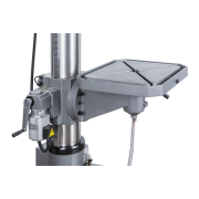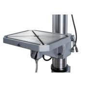 Массивный рабочий стол размером 570х480мм, изготовлен из высококачественного чугуна, имеет возможность вращения во круг своей оси и вокруг оси колонны на 360°. Наклон стола вправо и влево, осуществляется в пределах ±50°. Для закрепления приспособлений и заготовок предусмотрены 2 Т-образных паза, расположенные крест-накрест, с шириной пазов 14 мм.